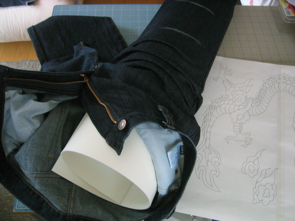 ジーンズにカッティングシートを貼りつけて、問題なければいよいよ彫り