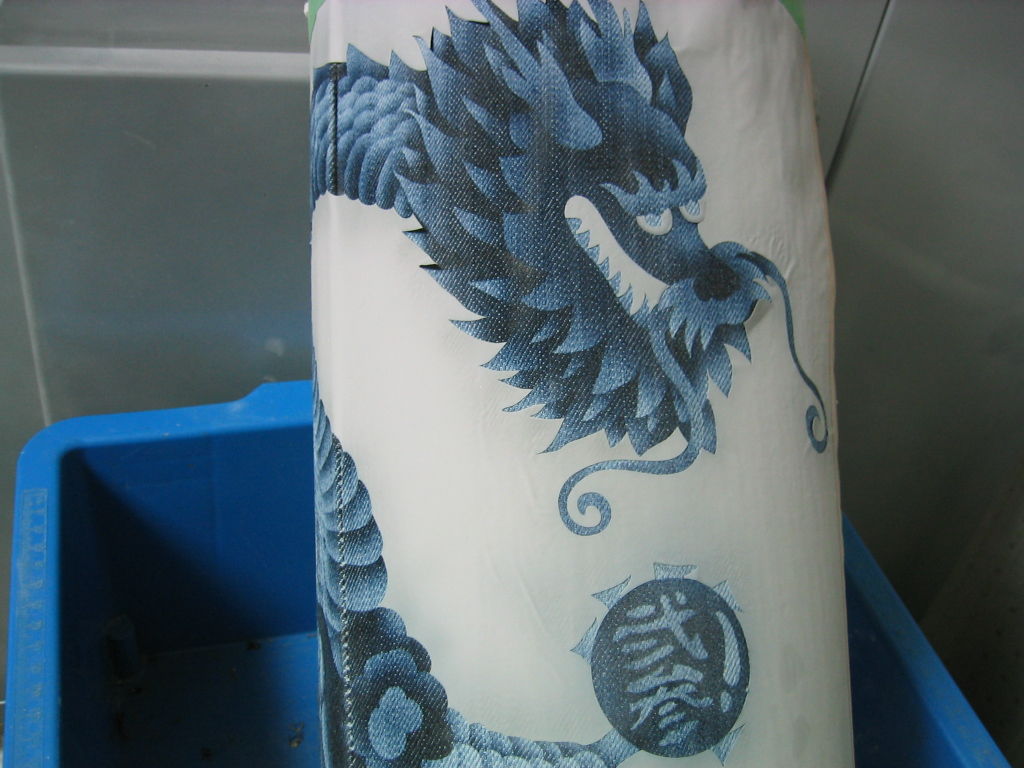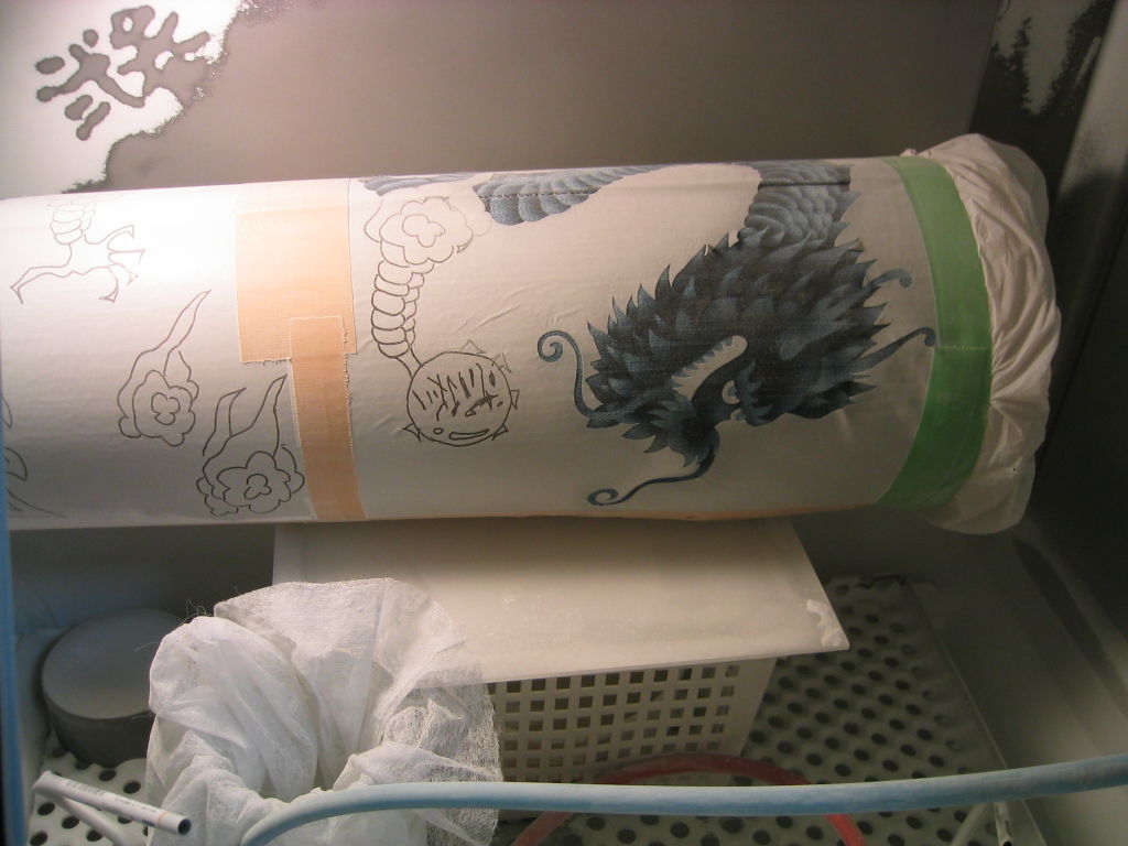 サンドブラスト作業中 ‐デニム(ジーンズ)「彫り前養生」‐