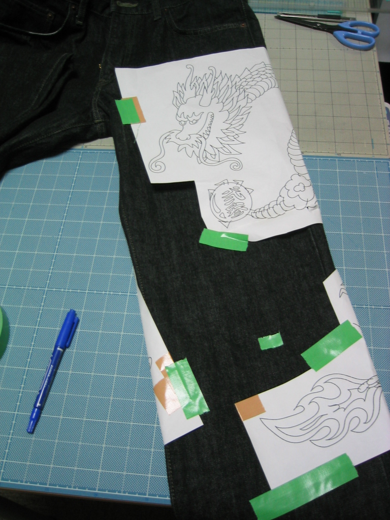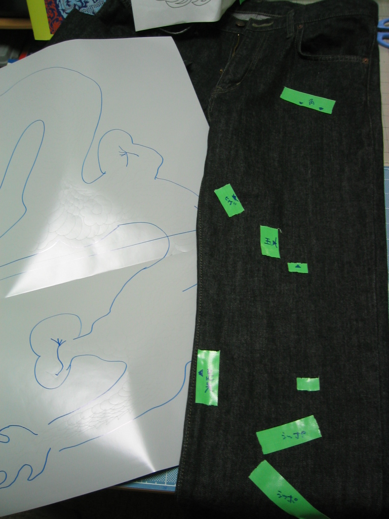 一度洗いにかけたジーンズも乾き、最終的な位置決めをして...♪