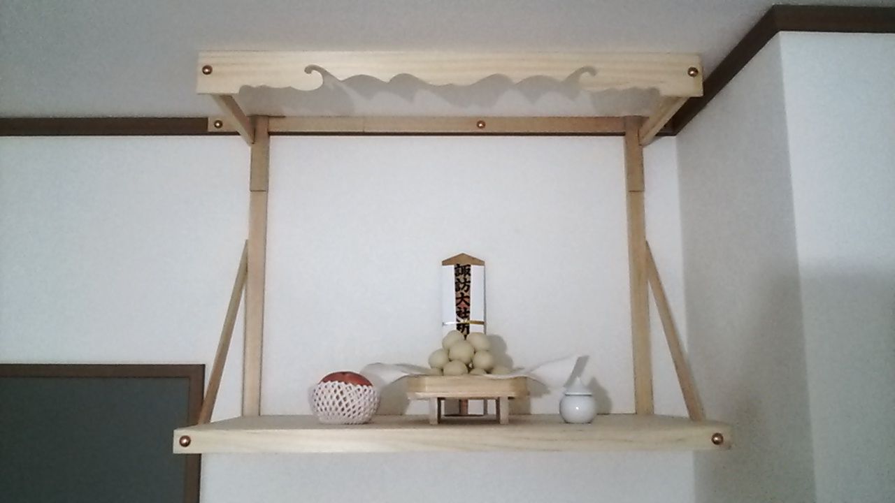 早速神棚を設置し、団子と桃をお供えして、ご報告!