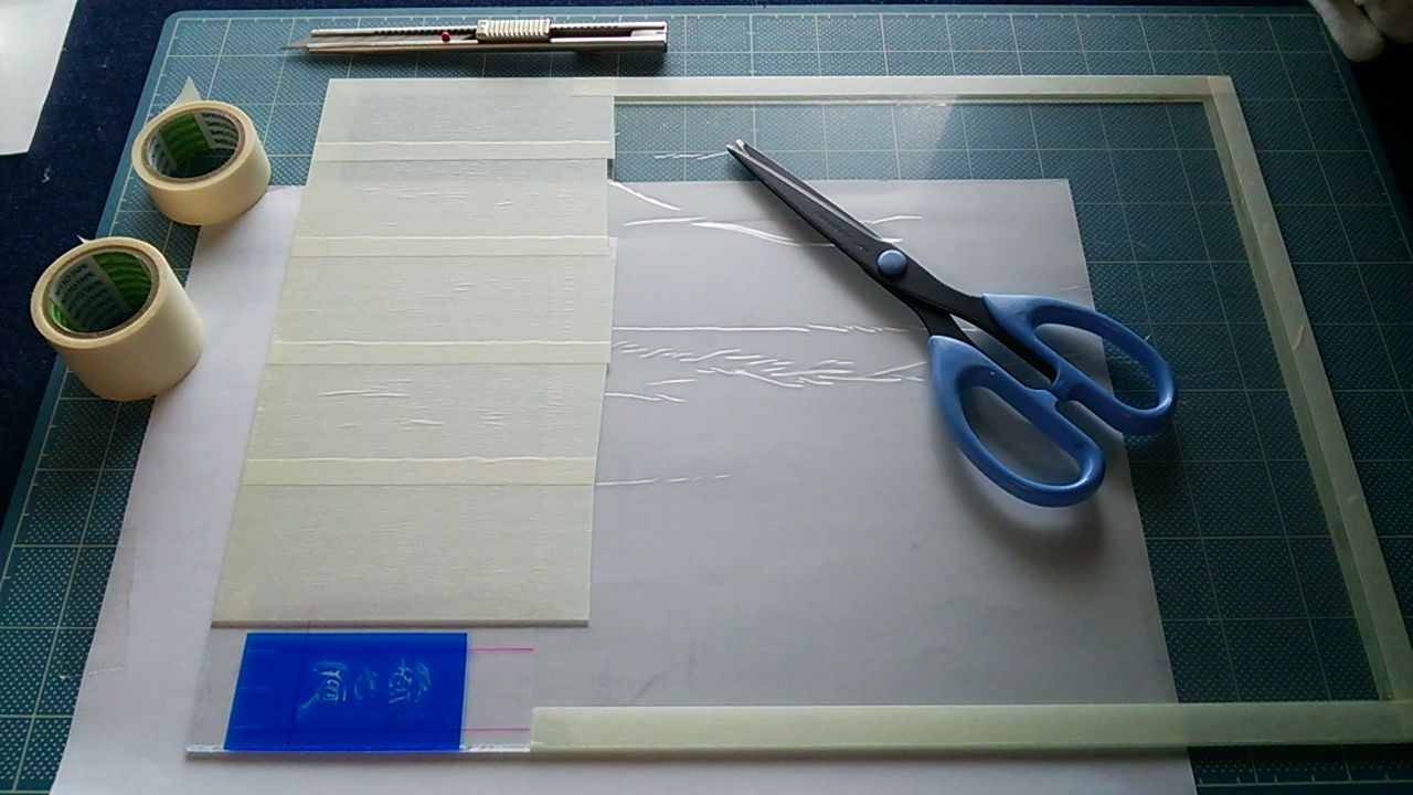 原稿フィルムを貼り、養生が終わったら「彫り」作業