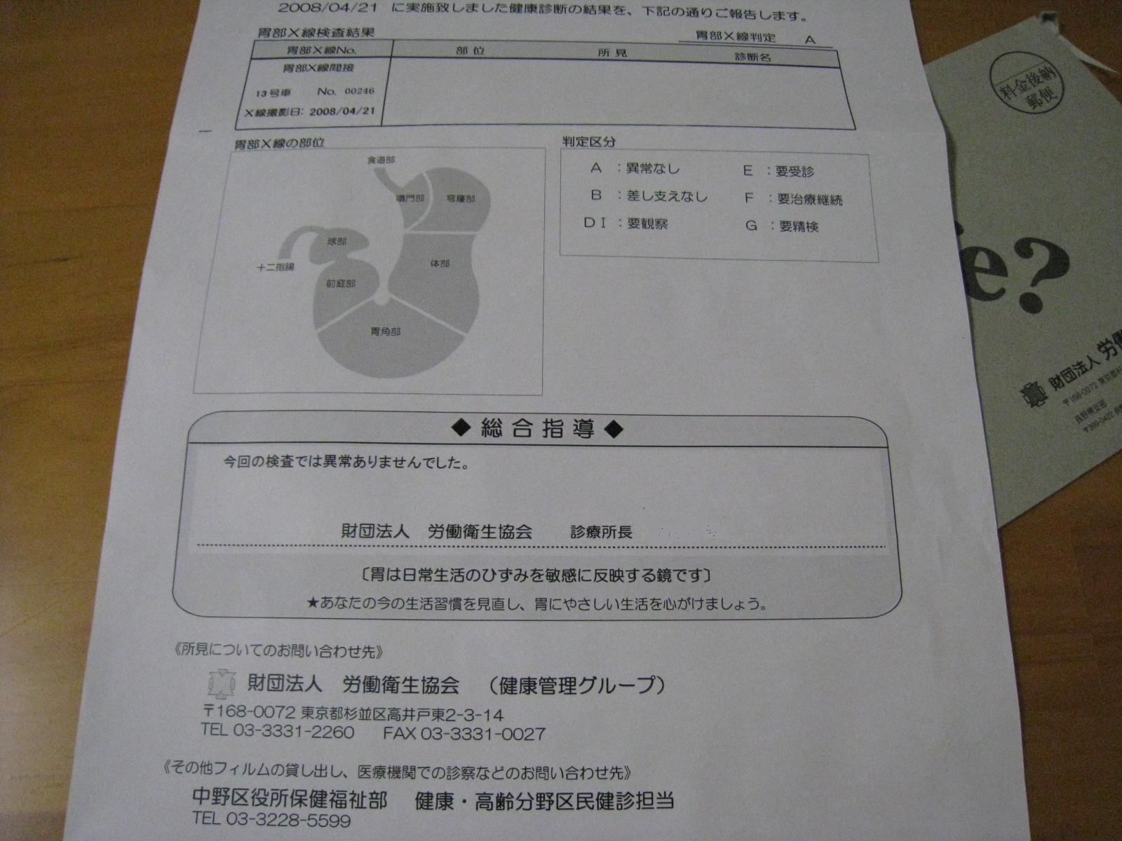 今日は、中野区の区民検診の内の「胃がん検診」。